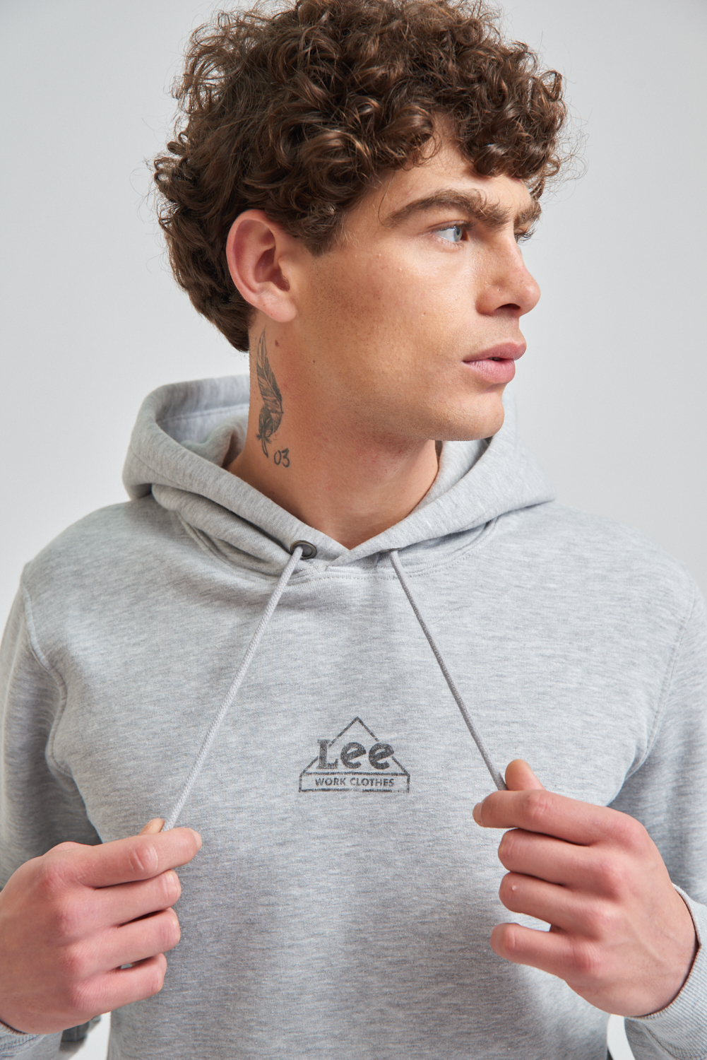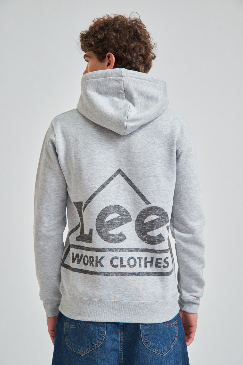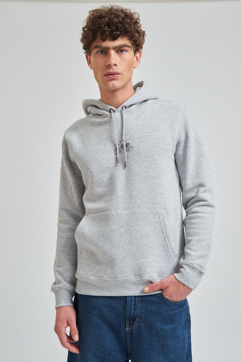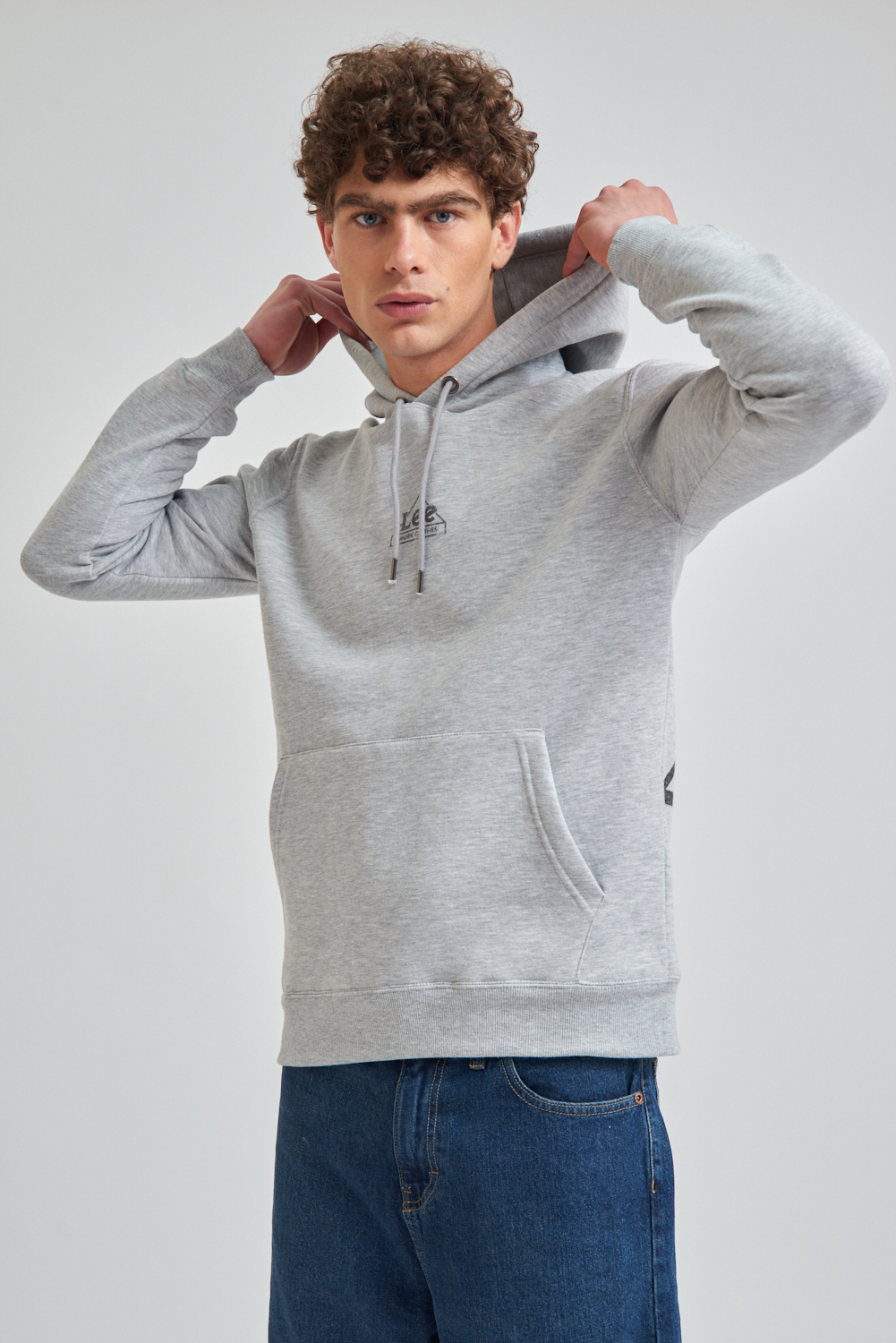 Hoodie de algodón frisado. Puños y cintura de reeb elástico. Estampa en el frente y en la espalda con efecto gastado. Bolsillo canguro. Composición 100% algodón frisado.