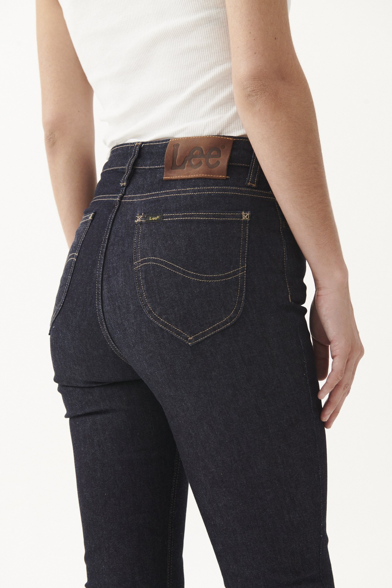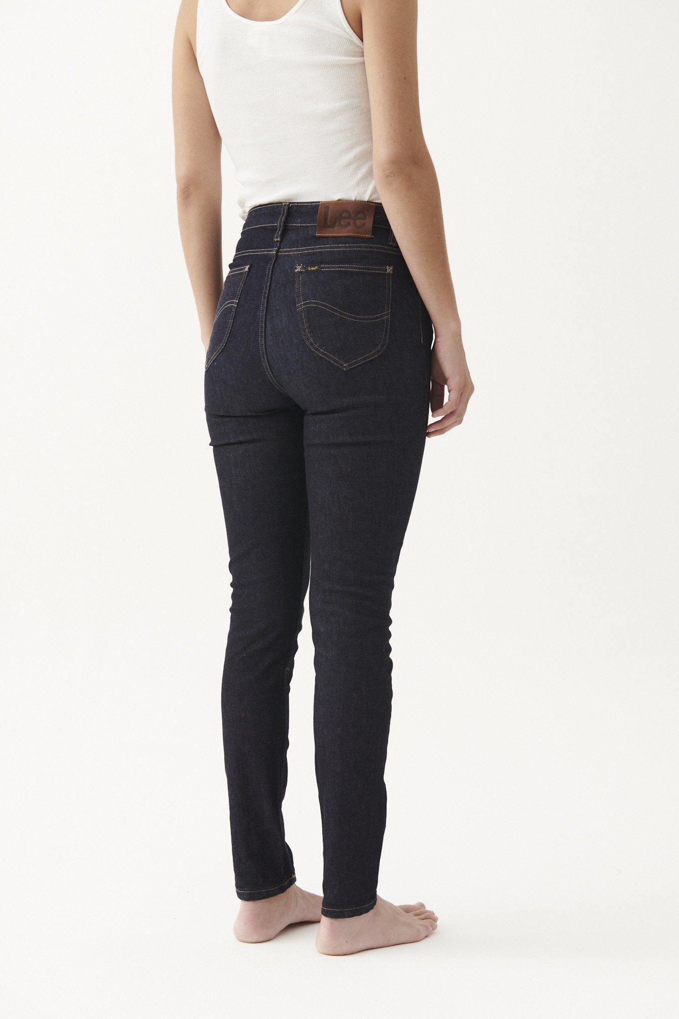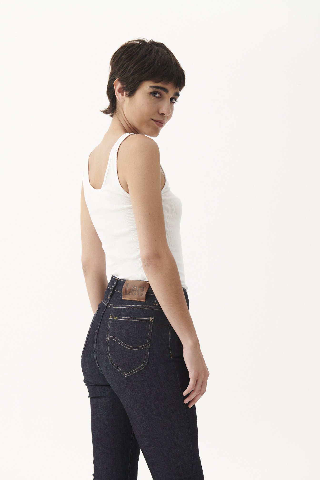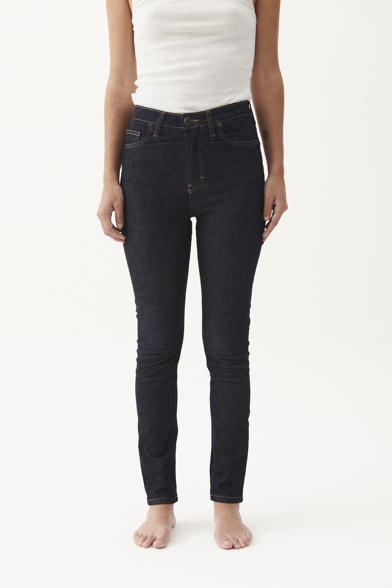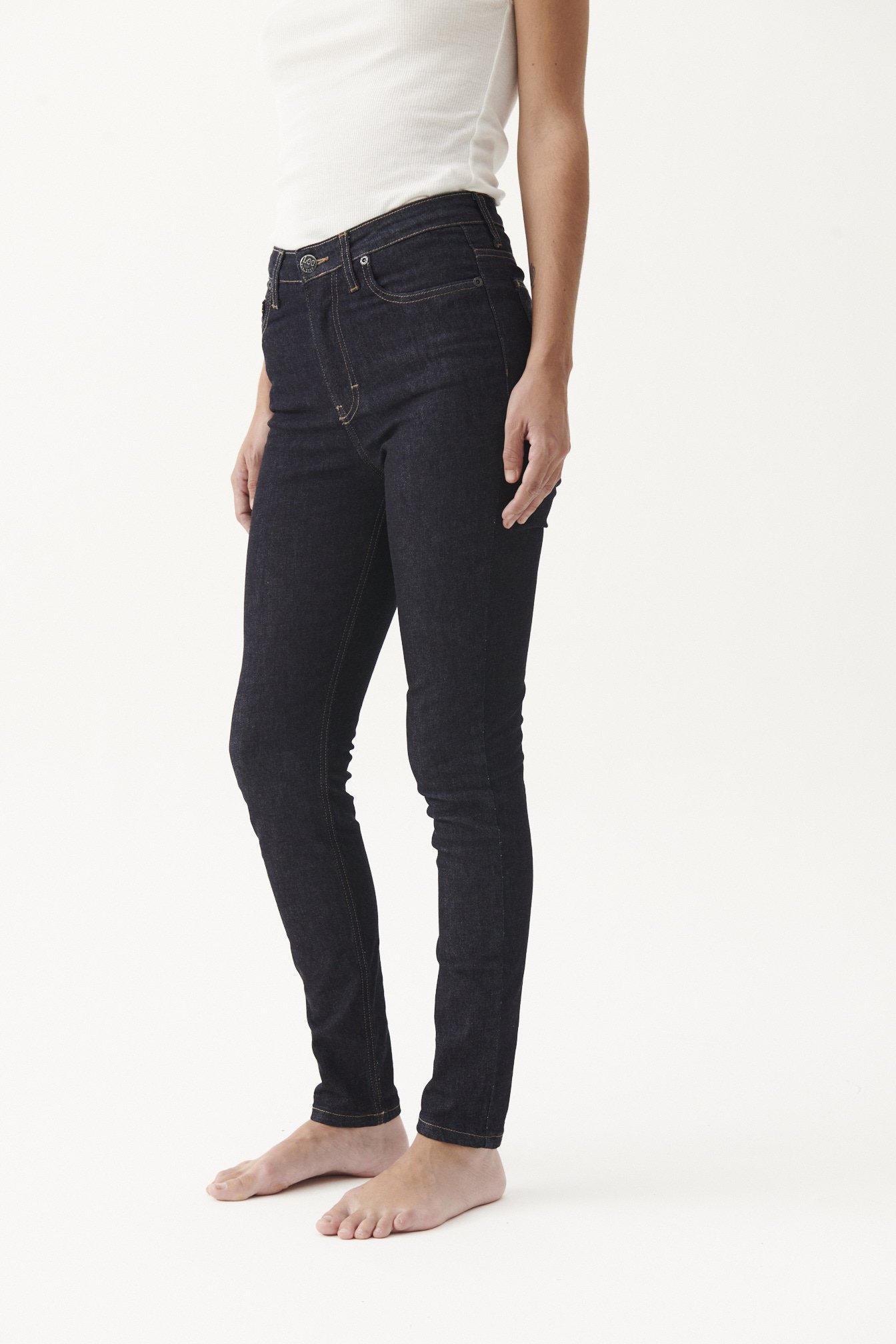 Jean tiro alto. Pierna ajustada. Botamanga recta. Composición 99% algodón, 1% poliéster.