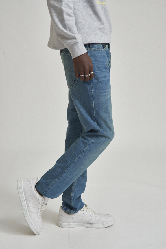 Jean de tiro medio, más amplio en caderas, muslos y piernas. Silueta suelta y cómoda. Construcción pensada para mayor movilidad y calce relajado. El modelo mide 1.78 y usa talle 28.