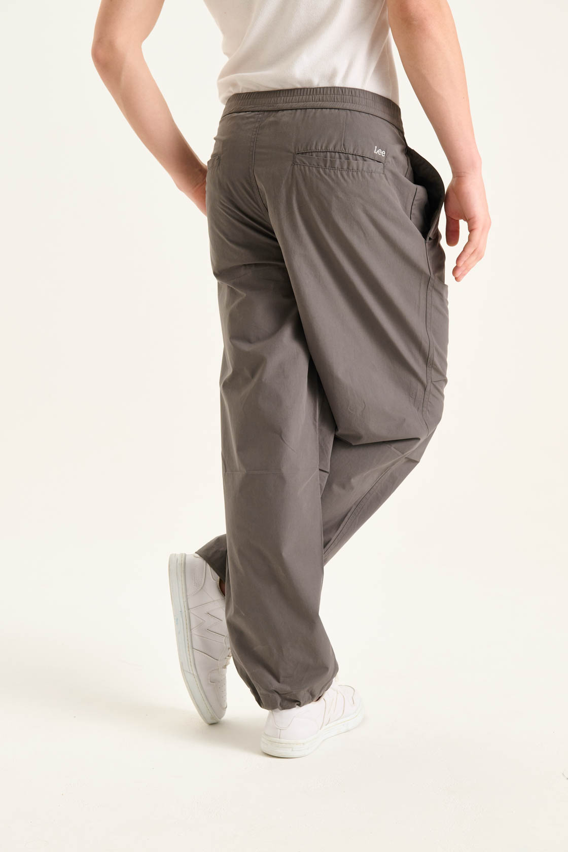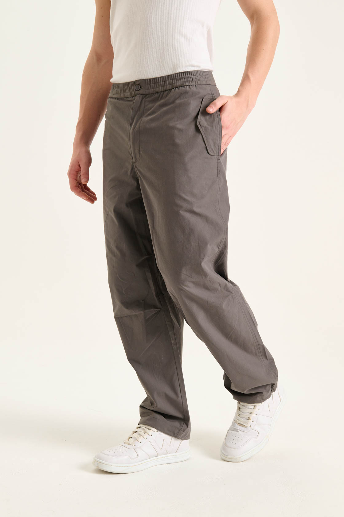 Pantalón de tiro medio confeccionado en tejido liviano con caída fluida. Calce relajado con pierna amplia y terminación con botamanga ajustable mediante elástico.